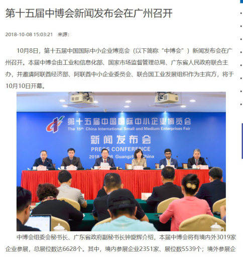 中國國際中小企業(yè)博覽會(huì)(簡稱中博會(huì))是在中共中央政治局常委、全國人大常委會(huì)委員長、時(shí)任廣東省委書記張德江的倡導(dǎo)下,經(jīng)中國國務(wù)院批準(zhǔn),于2004年創(chuàng)辦的。中博會(huì)由中國工業(yè)和信息化部、國家市場(chǎng)監(jiān)督管理總局、廣東省人民政府等部門主辦,每年秋季在廣東省廣州市舉辦,至今已經(jīng)成功舉辦十四屆,是國際展覽聯(lián)盟(UFI)認(rèn)證的國際展會(huì)。