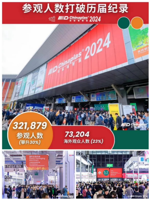 4月26日,為期四天的橡塑業(yè)界盛會 - CHINAPLAS 2024國際橡塑展在上海完滿落幕。本屆展會的參觀人數(shù)打破歷屆紀錄,達321,879,較上一年攀升30%。其中,海外觀眾人數(shù)達73,204(占整體23%),也創(chuàng)歷史新高,人氣有目共睹。