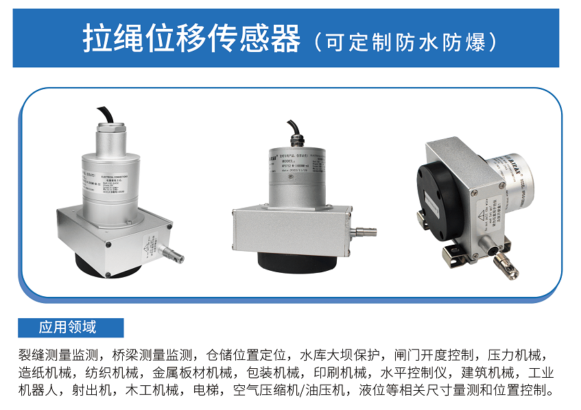 ?高精度和高穩(wěn)定性?:拉繩/線式位移傳感器具有高精度、高穩(wěn)定性的特點,適合在水利工程中使用。其內(nèi)部采用高精度磁感應編碼器和精密機械齒輪結構,無需電池也可做到掉電記憶,絕對位置信號輸出,確保測量精度和數(shù)據(jù)的穩(wěn)定性。