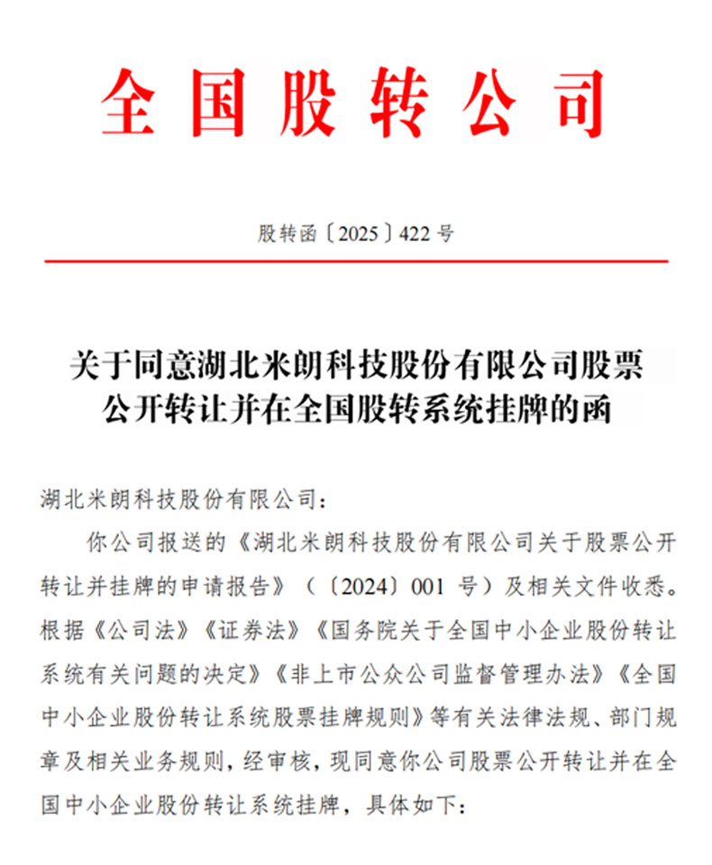 2025年3月25日,湖北米朗科技股份有限公司(簡稱米朗科技)順利取得全國中小企業(yè)股份轉(zhuǎn)讓系統(tǒng)有限責(zé)任公司(全國股轉(zhuǎn)公司)的同意掛牌函,正式在“新三板”掛牌上市。這一里程碑事件標志著米朗科技在資本市場的新起點,也預(yù)示著企業(yè)將迎來更加廣闊的發(fā)展空間和機遇。