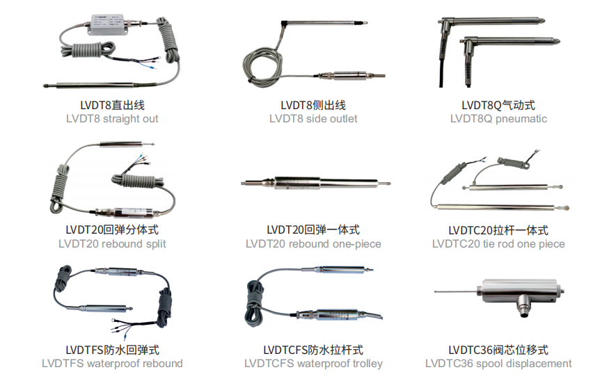 LVDT位移傳感器是線性差動變壓式位移傳感器的簡稱,LVDT位移傳感器工作原理是,在一個空心的骨架上饒了3組線圈,一組初級線圈兩組次級線圈,當(dāng)給初級線圈通電時空心的骨架內(nèi)會形成一個磁場,在一個導(dǎo)磁的鐵芯插入中空的骨架里面時,由于切割磁感應(yīng)線原理兩個次級線圈會形成一個微弱的交流電壓,當(dāng)鐵芯移動到某個次級線圈的位置多一點時這個次級線圈輸出的電壓相對于另一個線圈的電壓要要大一些,按照搞這個規(guī)律把兩個次級線圈輸出的電壓值經(jīng)過放大,再把兩個電壓值相減,得出一個差值,這個差值與鐵芯在空心骨架里面移動位移是成正比例線性關(guān)系的,這個差值再經(jīng)過處理可以處理成-5V、0-10V、4-20mA等模擬量信號或者Modbus SSI等數(shù)字量信號,也是我們使用的LVDT正常輸出的信號。