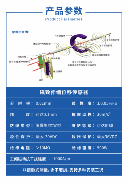 線性度:±0.05%FS,分辨率:0.01mm,精度可達(dá)0.1mm,抗震動(dòng)性30m/s2,工頻磁場(chǎng)抗干擾強(qiáng)度1000A/m,防護(hù)等級(jí)可達(dá)IP68,非接觸式測(cè)量,永不磨損,支持多種安裝工況!