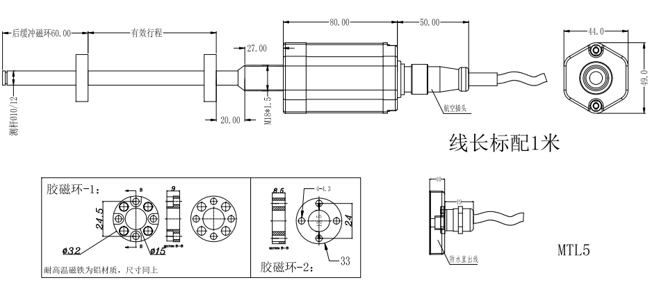 MTL5加強(qiáng)密封型磁致伸縮位移傳感器的安裝圖紙: