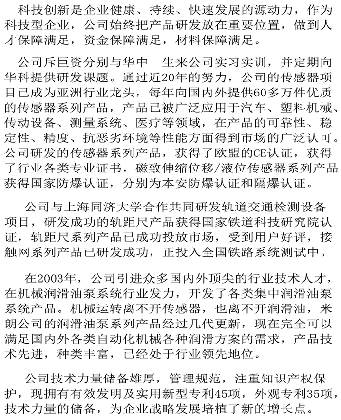 Our company has 50,000 square meters standardized workshop and more than 3,000 sets Production equipment. Scientific and technological innovation is the motivation of enterprise’s healthy, sustainable and rapid development. As a science and technology enterprise,our company has always put product research and development in an important position, ensure Talents guarantee contentment,fund guarantee contentment, material guarantee contentment. Our company has set up an Industry-University-Research platform with Huazhong university of science and technology since 2017, set up sensor research and development center, founded huazhong university of science and technology -- Miran production practice base, Organize students from Huazhong University of science and technology to practical training in the company in batches, and provide research and development projects to the university regularly. Through nearly 20 years of efforts, our company's sensor program has become the industry leader in Asia, each year we provide more than 600,000 pieces high quality sensors to both domestic and overseas market. Our products have been widely used in displacement measurement system of Industrial control automation, Lubrication system of transmission equipment, Railway monitoring and other fields, The product reliability、stability、accuracy、anti-adverse environment, and other performance has been widely recognized by the market, Sensor Series products researched by our company, Awarded CE certification from EU, also obtained all kinds of patent certificates along this industry, Our magnetostrictive displacement/liquid level sensor series products, awarded the National Explosion Proof Certificate. Our company and Shanghai Tongji university, Cooperate to develop rail transit detection equipment project, successful development of gauging rule, awarded National Academy of railway science and technology certification, gauging rule series products have been successfully launched to the market, and got good reputation from the customers, contact net products has been developed successfully, it is being tested across national railway system.