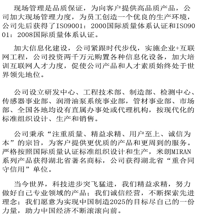 In 2003, our company introduced many domestic and oversea top technical talents,Invested in mechanical lubrication pump system industry, Developed all kinds of centralized lubricating oil pump system products. Machinery can’t run without sensors, and also lubricant pumps,Miran company's lubricat pump after several generations of updates,The pumps can absolutely satisfy the requirements of lubrication program for all kinds of domestic and oversea automation machinery,Advanced product technology, abundant species, has been in leading position among the industry.Our company has abundant technical strength reserve, standard management, regard protection of intellectual property rights. Now Miran has 45 effective invention and utility model patents, 35 appearance patents ,the reserves of technical power, cultivated a new growth point for the development of enterprise strategy. Site management is the quality assurance, In order to provide customers high quality products, our company strengthened the site management to create a good production environment for employees, our company has obtained ISO9001:2000 international quality system certification, and ISO9001:2008 international quality system certification.Increasing the construction of information, Miran company keep pace with the pace of The Times,implement the enterprise plus Internet project,Strengthen the training of Internet talents, to ensure the company's products and talent quality always in the world's leading position.