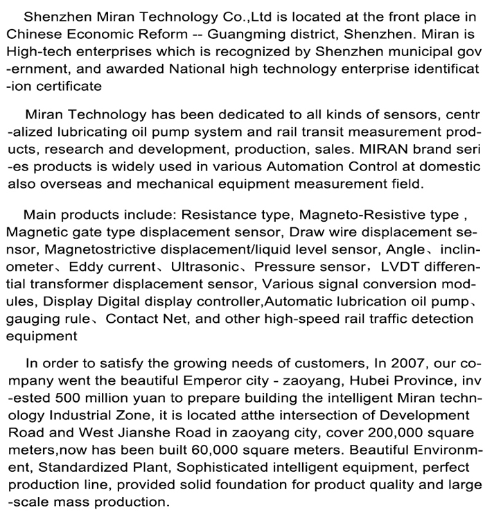 Main products include: Resistance type, Magneto-Resistive type , Magnetic gate type displacement sensor, Draw wire displacement sensor, Magnetostrictive displacement/liquid level sensor, Angle、inclinometer、Eddy current、Ultrasonic、Pressure sensor,LVDT differential transformer displacement sensor, Various signal conversion modules, Display Digital display controller,Automatic lubrication oil pump、gauging rule、Contact Net, and other high-speed rail traffic detection equipment
