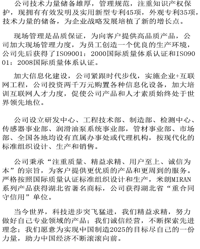 In 2003, our company introduced many domestic and oversea top technical talents,Invested in mechanical lubrication pump system industry, Developed all kinds of centralized lubricating oil pump system products. Machinery can’t run without sensors, and also lubricant pumps,Miran company's lubricat pump after several generations of updates,The pumps can absolutely satisfy the requirements of lubrication program for all kinds of domestic and oversea automation machinery,Advanced product technology, abundant species, has been in leading position among the industry.Our company has abundant technical strength reserve, standard management, regard protection of intellectual property rights. Now Miran has 45 effective invention and utility model patents, 35 appearance patents ,the reserves of technical power, cultivated a new growth point for the development of enterprise strategy. Site management is the quality assurance, In order to provide customers high quality products, our company strengthened the site management to create a good production environment for employees, our company has obtained ISO9001:2000 international quality system certification, and ISO9001:2008 international quality system certification.Increasing the construction of information, Miran company keep pace with the pace of The Times,implement the enterprise plus Internet project,Strengthen the training of Internet talents, to ensure the company's products and talent quality always in the world's leading position.