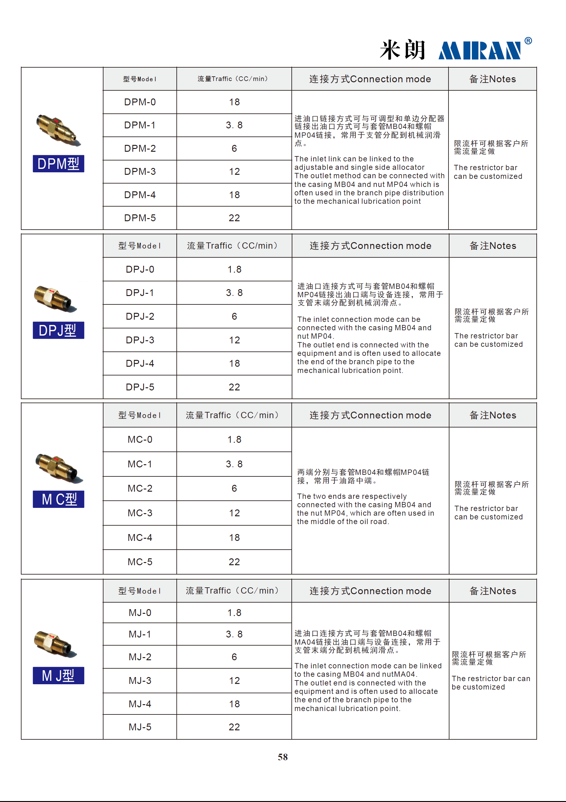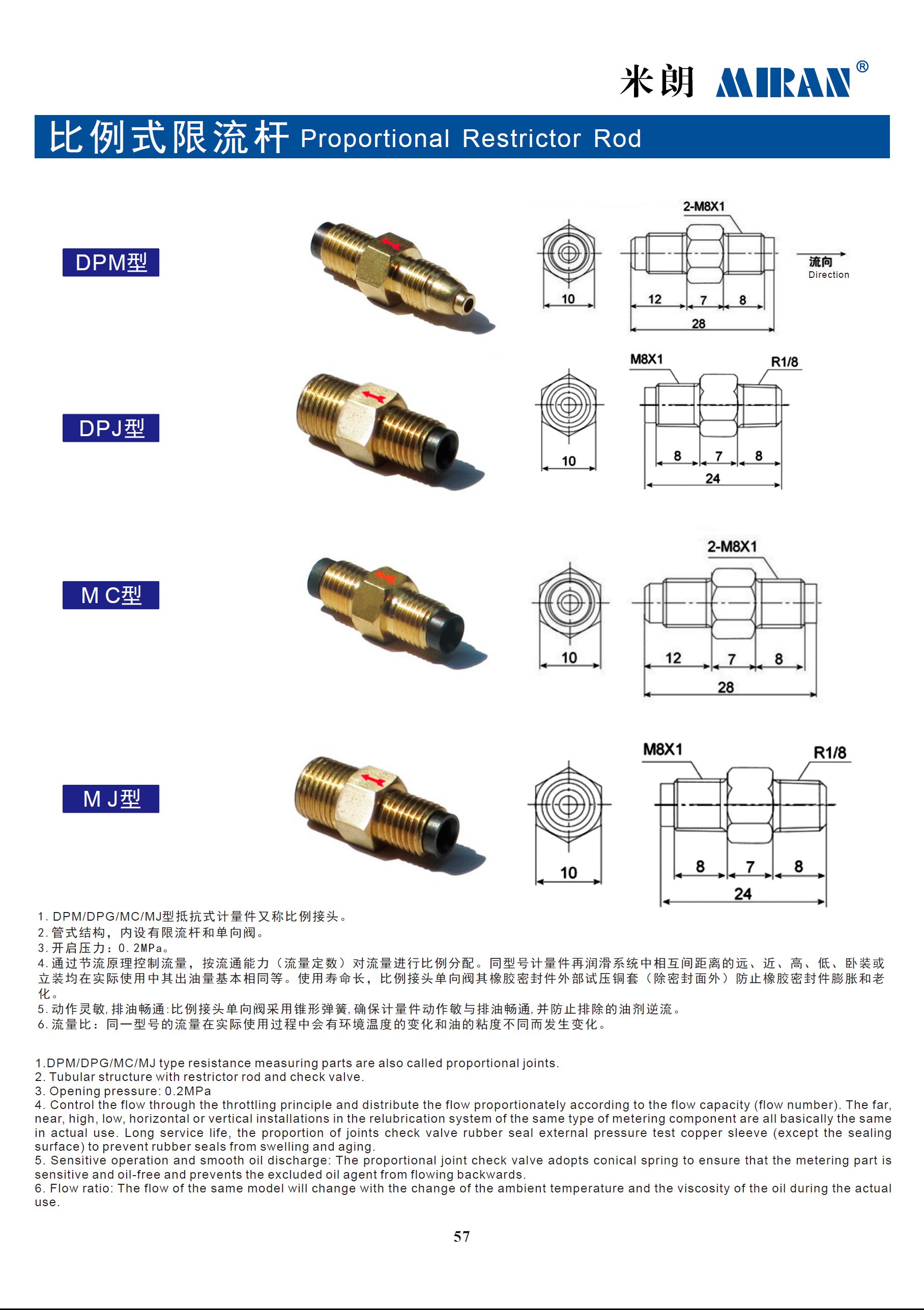1.DPM/DPG/MC/MJ type resistance measuring parts are also called proportional joints. 2. Tubular structure with restrictor rod and check valve. 3. Opening pressure: 0.2MPa 4. Control the flow through the throttling principle and distribute the flow proportionately according to the flow capacity (flow number). The far,near, high, low, horizontal or vertical installations in the relubrication system of the same type of metering component are all basically the samein actual use. Long service life, the proportion of joints check valve rubber seal external pressure test copper sleeve (except the sealing surface) to prevent rubber seals from swelling and aging. 5. Sensitive operation and smooth oil discharge: The proportional joint check valve adopts conical spring to ensure that the metering part is sensitive and oil-free and prevents the excluded oil agent from flowing backwards. 6. Flow ratio: The flow of the same model will change with the change of the ambient temperature and the viscosity of the oil during the actual use.
