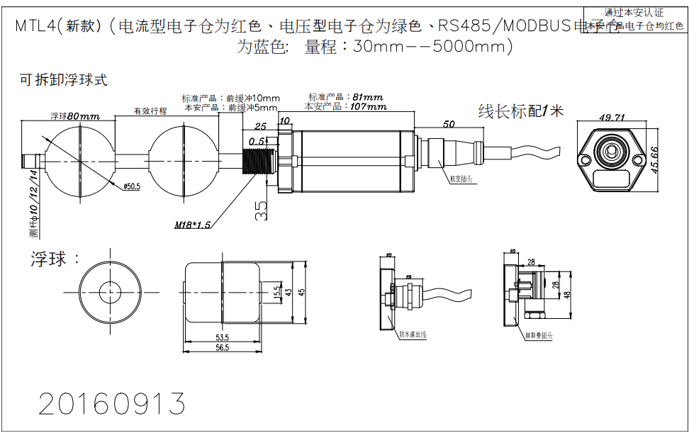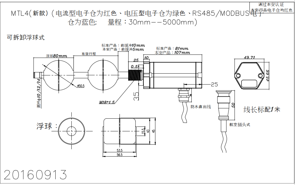 四、MTL4浮球式磁致伸縮液位傳感器安裝尺寸圖: