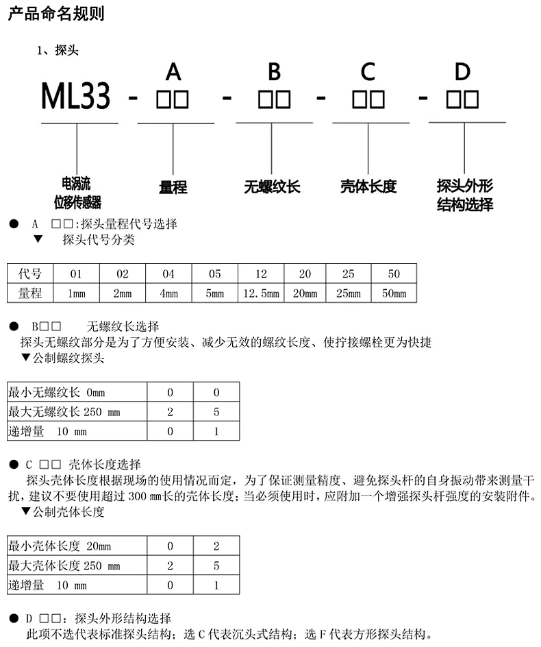 在制作過(guò)程中,探頭頭部體一般采用耐高溫PPS工程塑料,通過(guò)“二次注塑”成型將線圈密封其中。使探頭在惡劣的環(huán)境中能可靠工作。由于頭部體線圈直徑?jīng)Q定傳感器系統(tǒng)的線性量程,因此我們通常用頭部體外部直徑來(lái)分類和表征各型號(hào)探頭,一般情況下傳感器系統(tǒng)的線性量程大致是探頭頭部直徑的1/2~1/4倍。ML33系列傳感器探頭見(jiàn)圖所示(標(biāo)準(zhǔn)型):