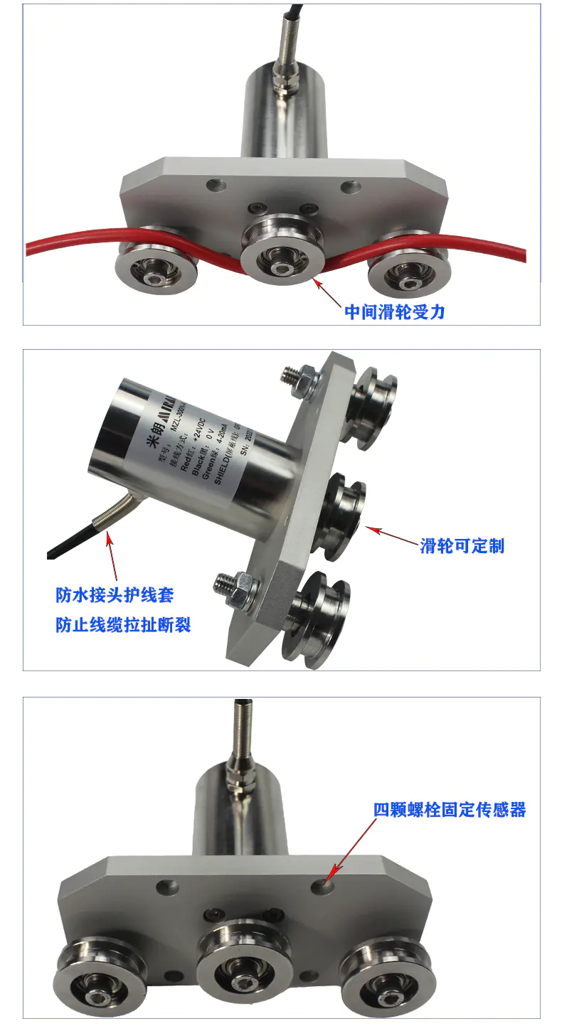 米朗科技張力傳感器采用合金鋼材質(zhì),穩(wěn)定性高,安裝方便,信號穩(wěn)定抗干擾,可安裝不同規(guī)格滑輪 。