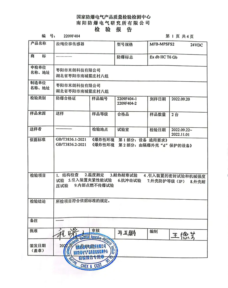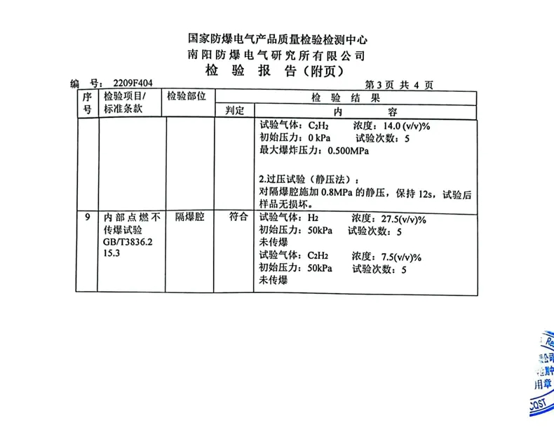 經(jīng)對上述產(chǎn)品圖樣及技術(shù)文件的審查和樣品檢驗,確認(rèn)符合下列標(biāo)準(zhǔn):GB/T3836.1- 2021《爆炸性環(huán)境第1部分:設(shè)備通用要求》,GB/T3836.2- -2021《爆炸性環(huán)境 第2部分:由隔爆外殼"d"保護(hù)的設(shè)備》。