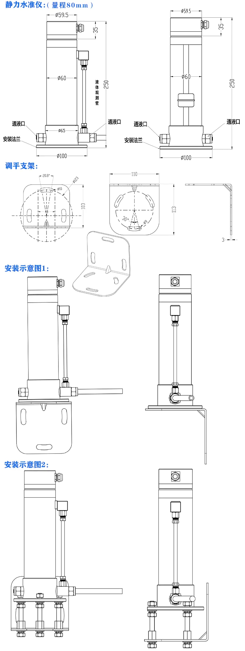 磁致伸縮式靜力水準儀是一種高精密液位測量儀器,由一個高精度的磁致伸縮液位計加上儲液罐,液位浮球,調(diào)平支架,水管等部件構成。在使用中,多個靜力水準儀的容器用通液管聯(lián)接,每一容器的液位由相關傳感器測出,進而可測出各測點的液位變化量。