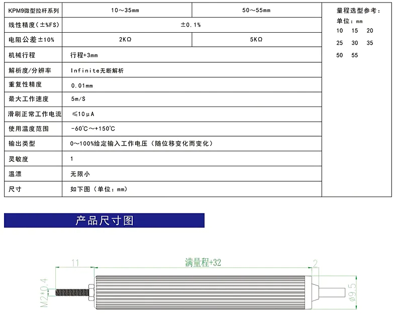 KPM9微型拉桿式位移傳感器技術(shù)參數(shù)及安裝尺寸: