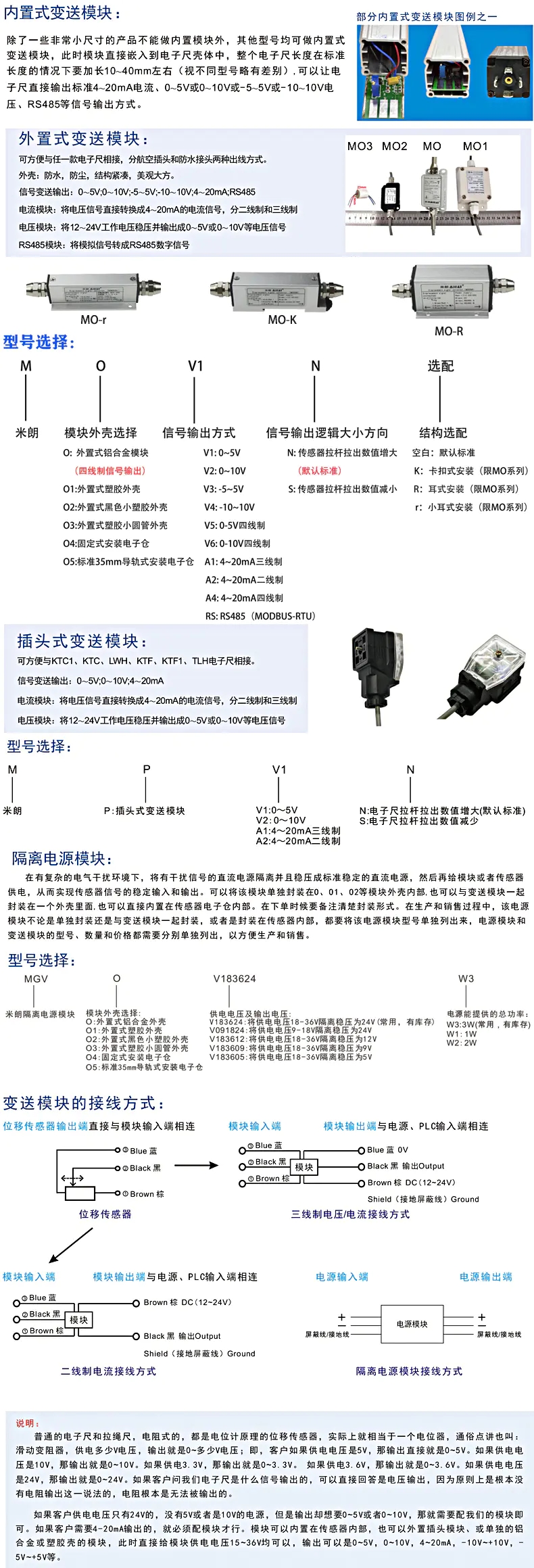 如果供電電壓只有24V的,沒有5V或者是10V的電源,但是輸出卻想要0-5V或者0-10V,那就需要配我們的模塊即可。如果需要4-20MA或者RS485輸出的,就必須配模塊才行。模塊可以內(nèi)置在傳感器內(nèi)部,也可以外置插頭模塊(限模擬量信號輸出)、或單獨的鋁合金或塑膠殼的模塊。