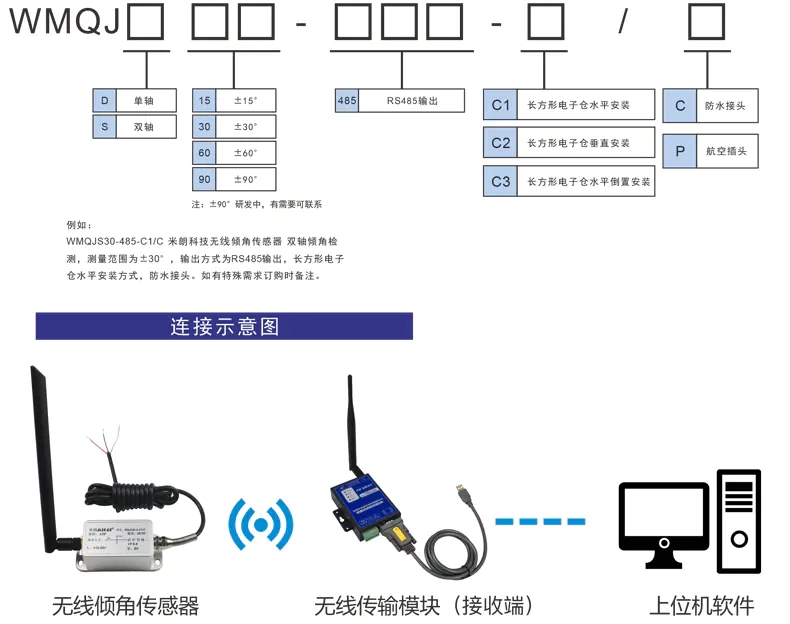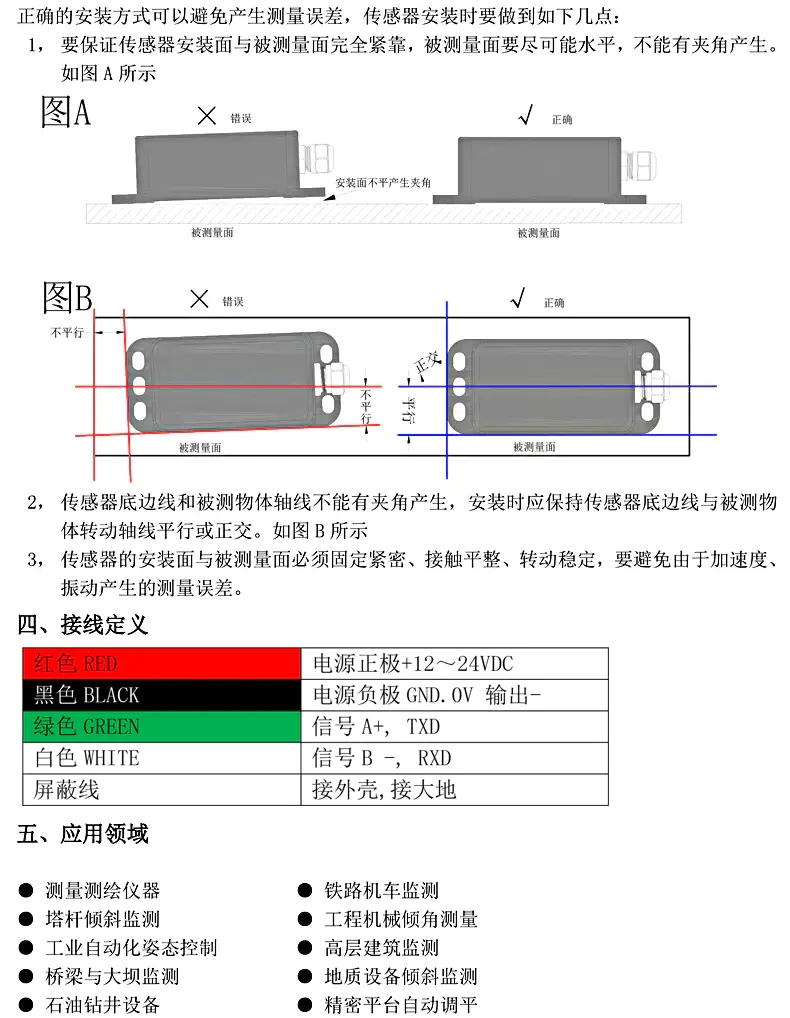 三、無(wú)線傾角傳感器安裝方式與接線方式: