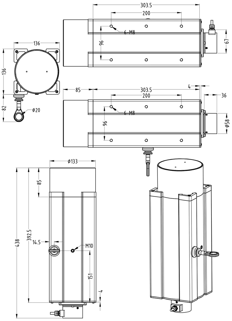 1、利用底部6個(gè)(任意三面,拉頭面不可固定)固定螺絲孔,依現(xiàn)場(chǎng)及機(jī)器安裝空間設(shè)施需要,直接安裝或另加保護(hù)或其他機(jī)械使用。