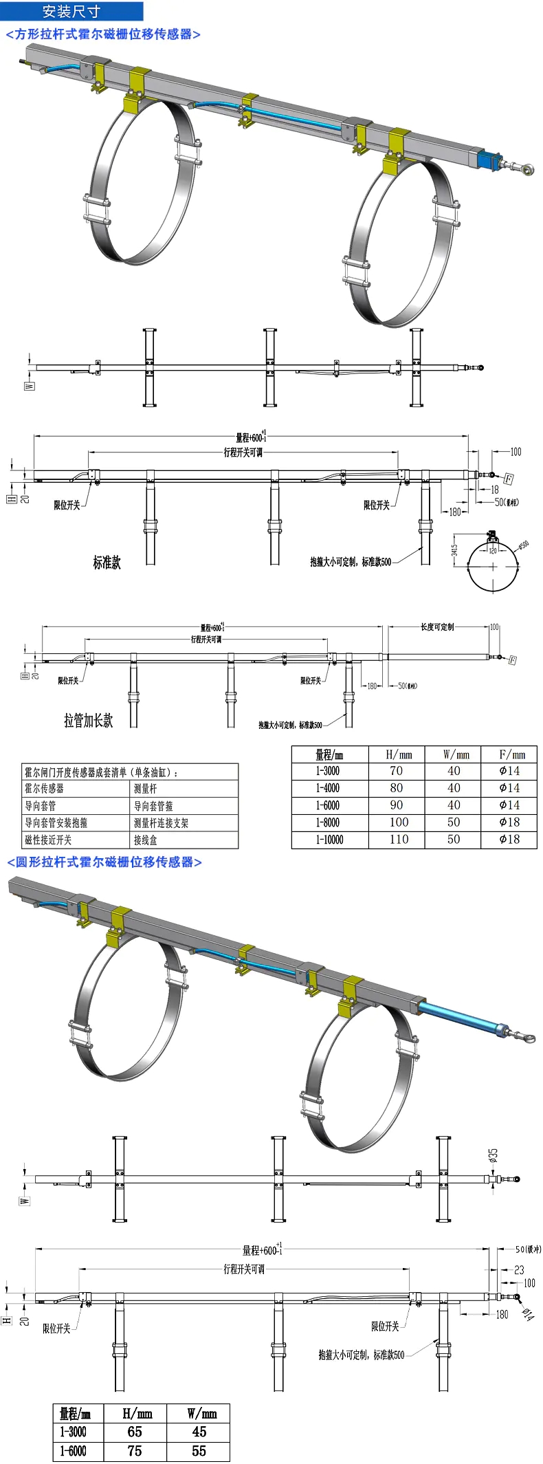 三、閘門開度(霍爾磁柵)位移傳感器技術(shù)參數(shù)及安裝尺寸: