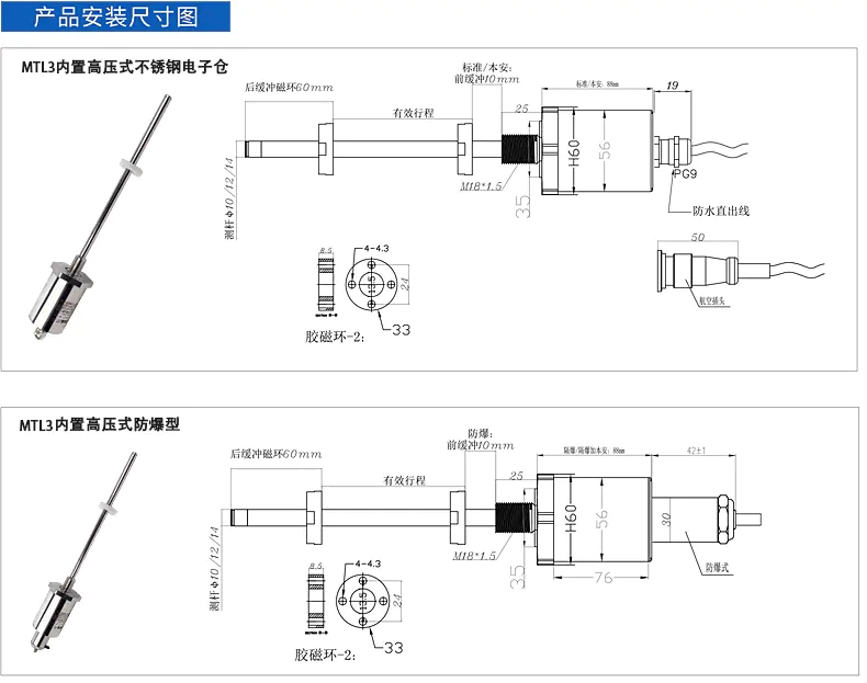 五、閘門開度內(nèi)置高壓式(磁致伸縮)位移傳感器安裝尺寸圖: