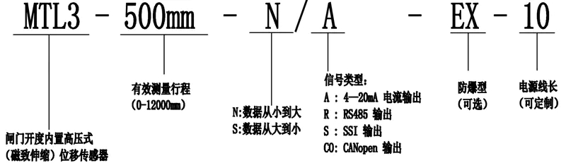 六、閘門開度內(nèi)置高壓式(磁致伸縮)位移傳感器選型: