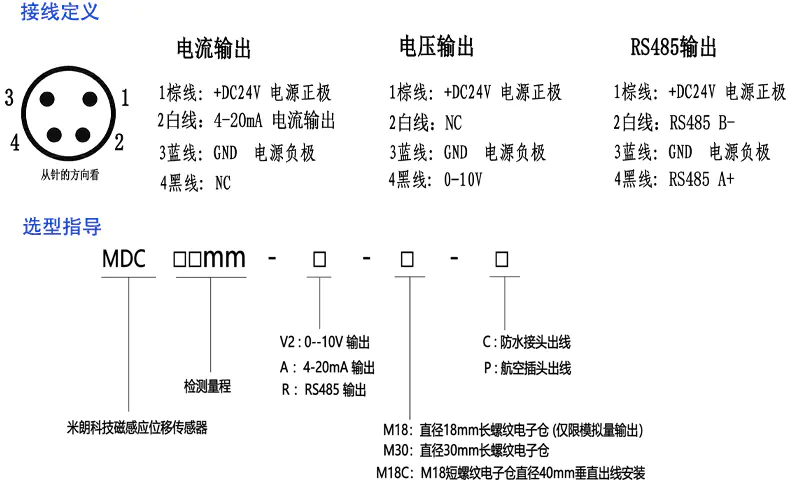 四、MDC磁感應(yīng)位移傳感器技術(shù)參數(shù)、接線定義及選型指導(dǎo):