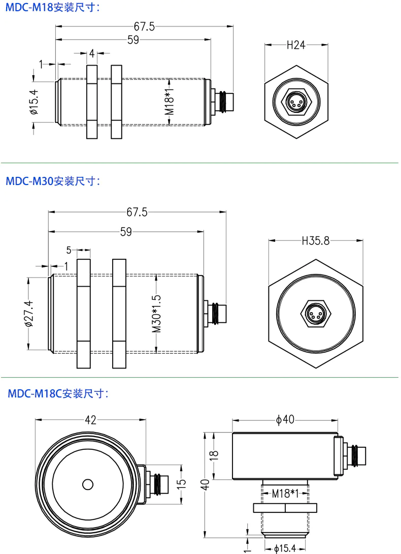 標(biāo)準(zhǔn)外殼:M18/M30不銹鋼螺紋殼體(IP68),或扁平塑料外殼(輕量化安裝)。