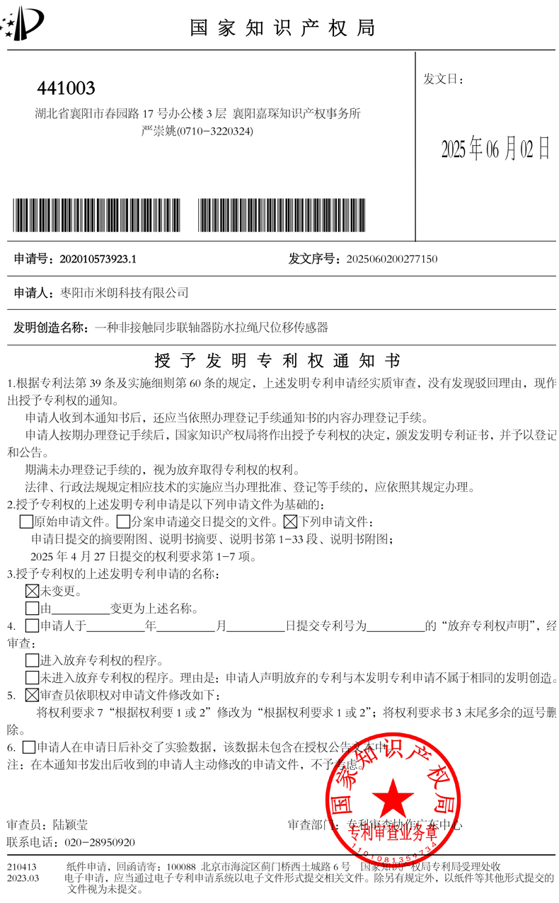 • 防水拉繩位移傳感器發(fā)明專 利證書
