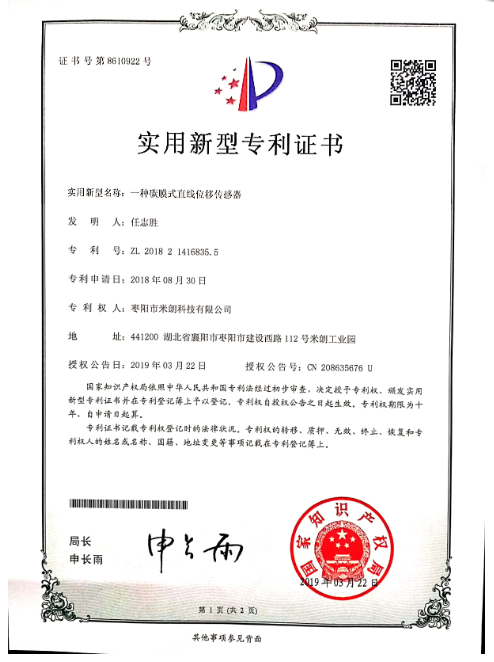 碳膜直線位移傳感器證書(shū)