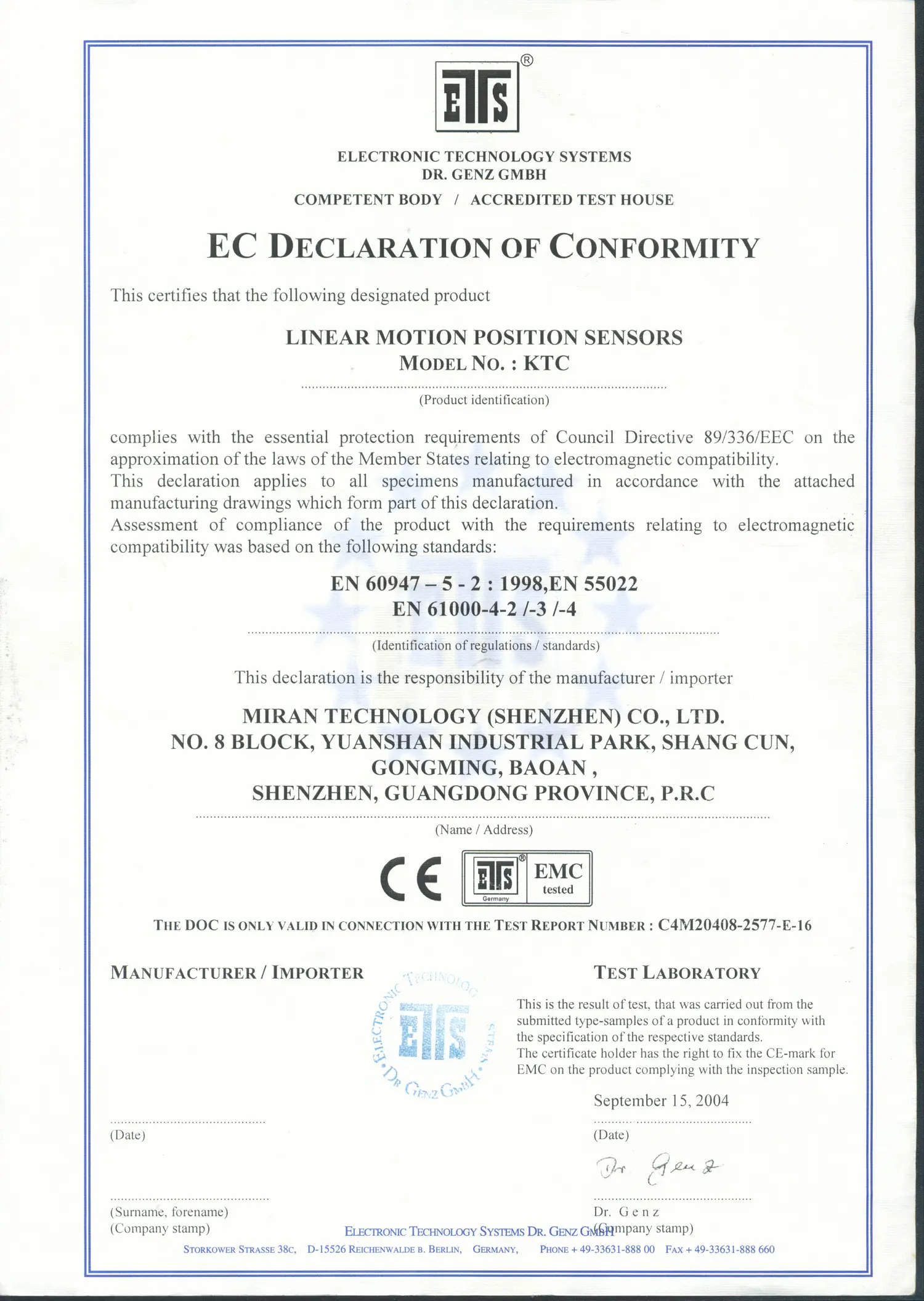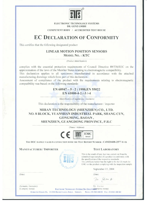 KTC直線位移傳感器CE認(rèn)證證書Product introduction 您現(xiàn)在的位置:首 頁 > 產(chǎn)品展示 > 產(chǎn)品詳情