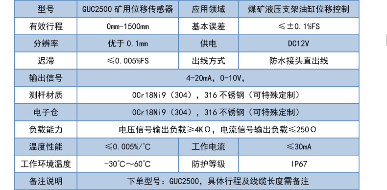 二、GUC2500礦用本安磁致伸縮位移傳感器技術(shù)參數(shù):